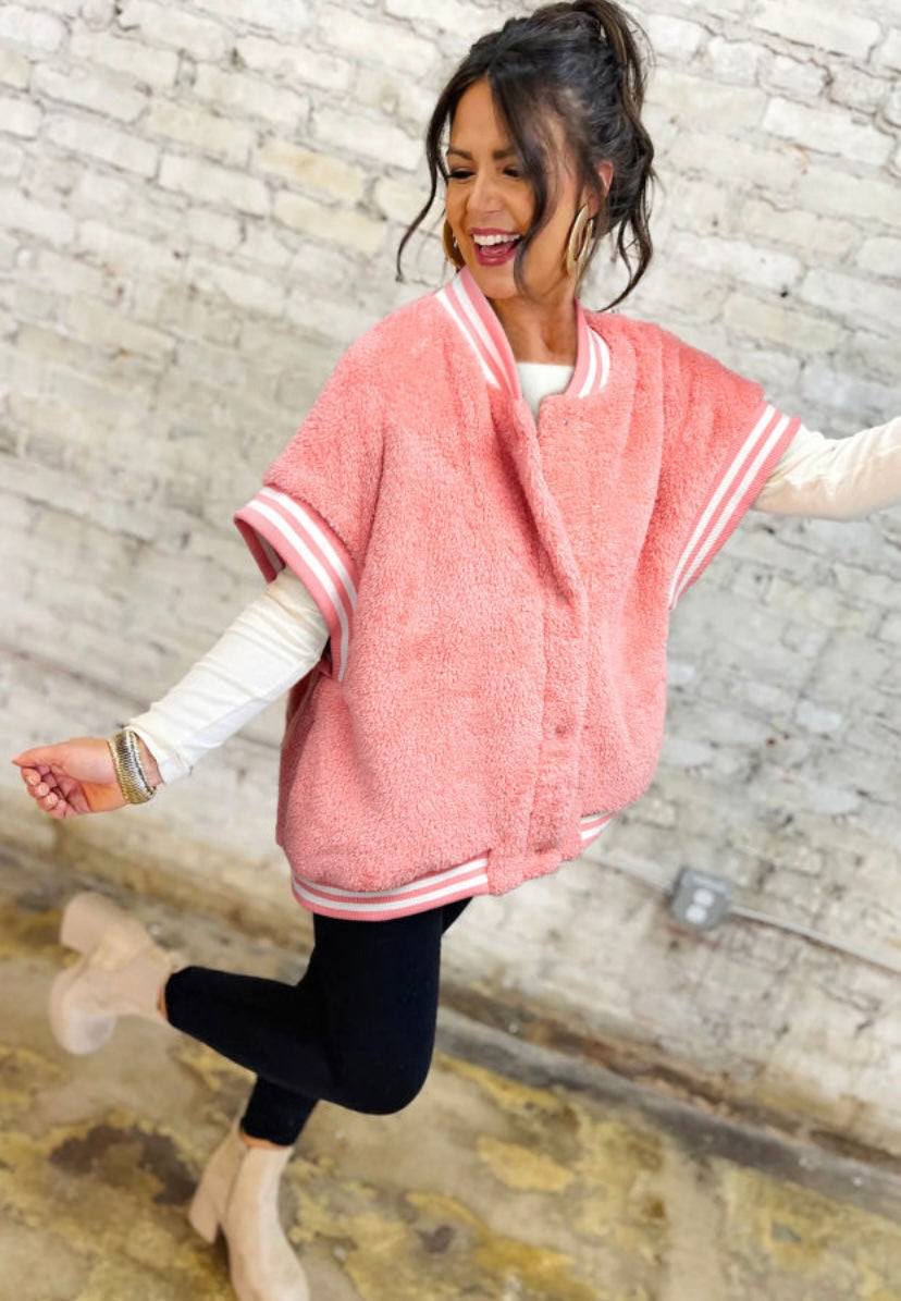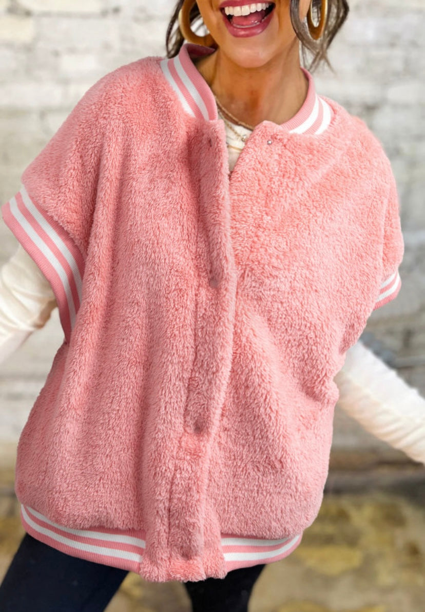 Pink Fuzzy Varsity Button Vest - Small is backordered and will ship as soon as it is back in stock.