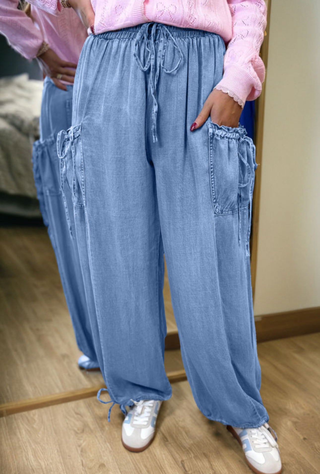 Taking It Easy Tie Waist Cargo Denim Pants - 4 is backordered and will ship as soon as it is back in stock.