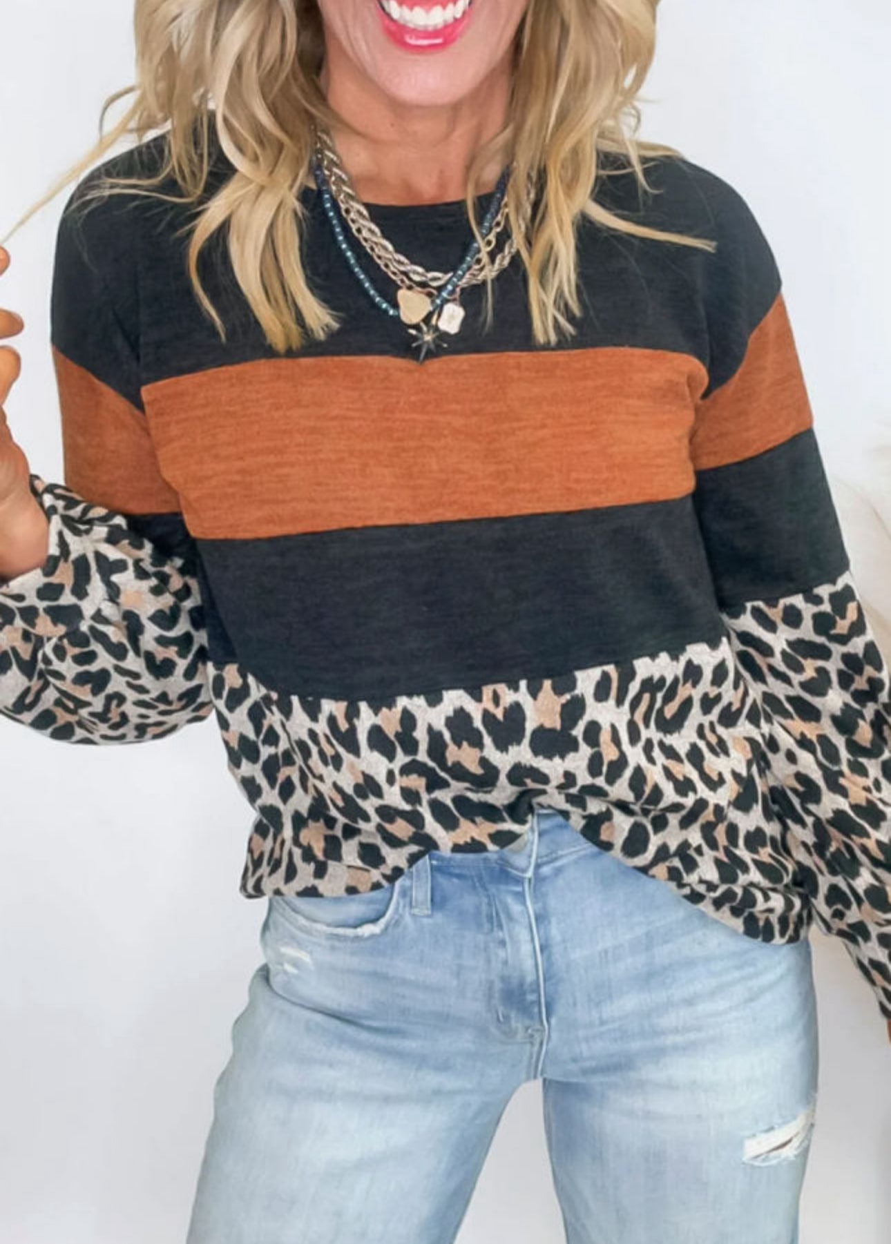The Perfect Mix Leopard Fall Color Block Top - Small is backordered and will ship as soon as it is back in stock.