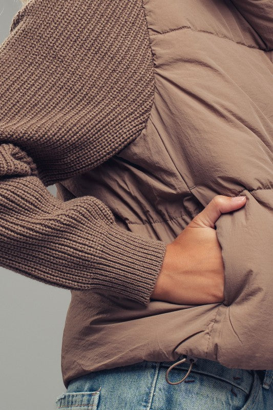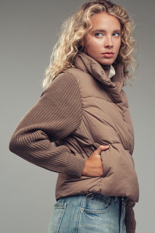 Experience cozy warmth and modern style in this padded jacket, featuring a plush body and soft sweater-knit sleeves.
