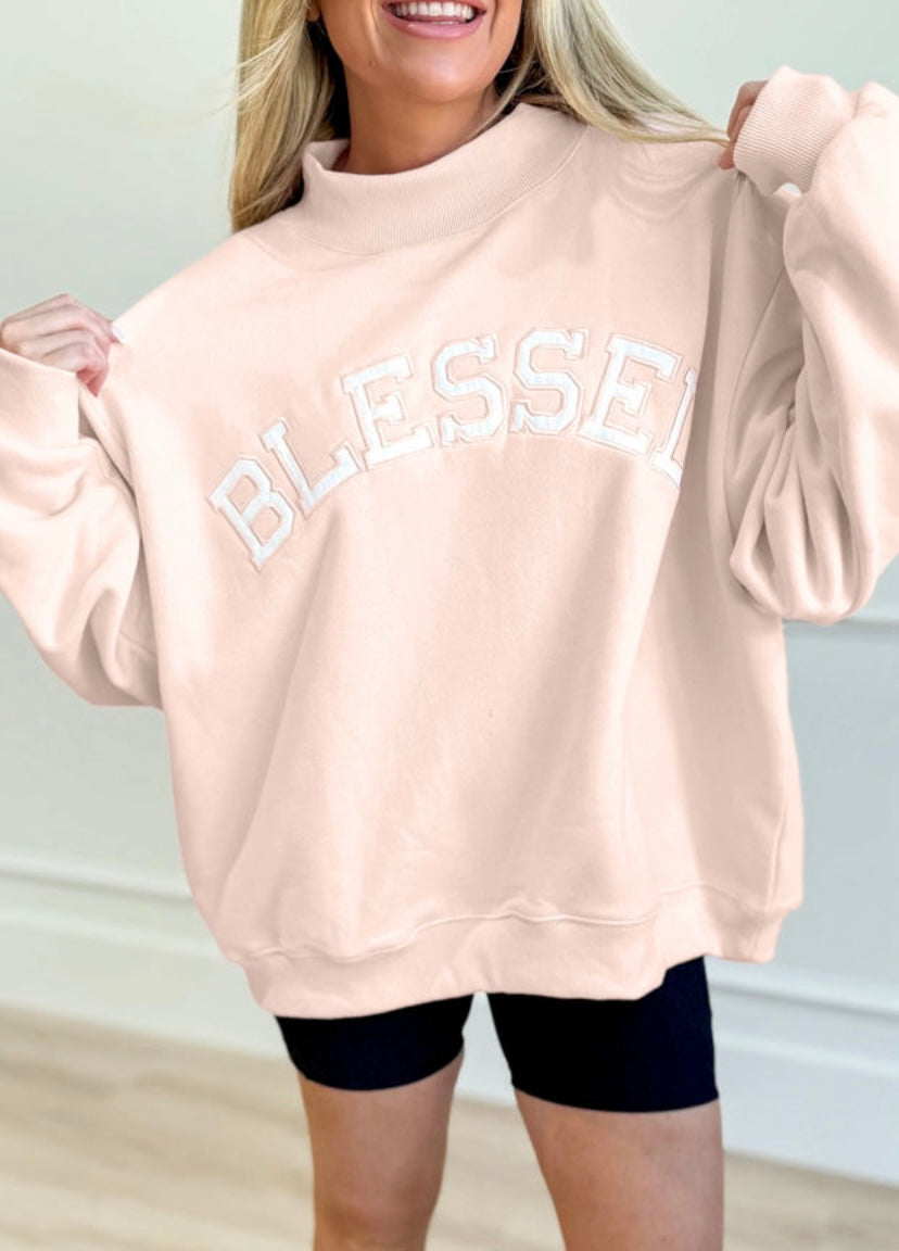 Blessed Embroidered Oversized Mock Neck Sweatshirt - Small is backordered and will ship as soon as it is back in stock.