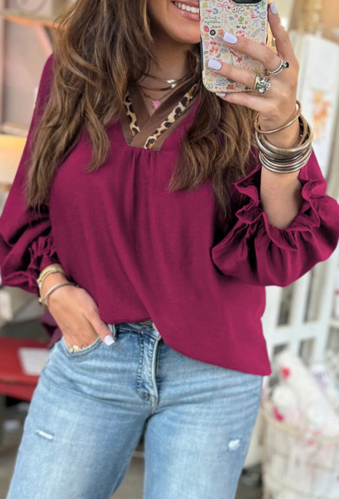 Burgundy Bliss Leopard V Neck Top - Small is backordered and will ship as soon as it is back in stock.