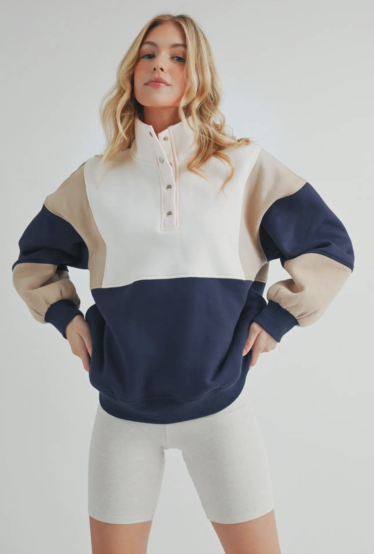 Introducing our chic Glo colorblock pullover, teaturing stylish snap buttons for easy wear. This versatile piece combines comfort and modern design, making it a perfect addition to any wardrobe.