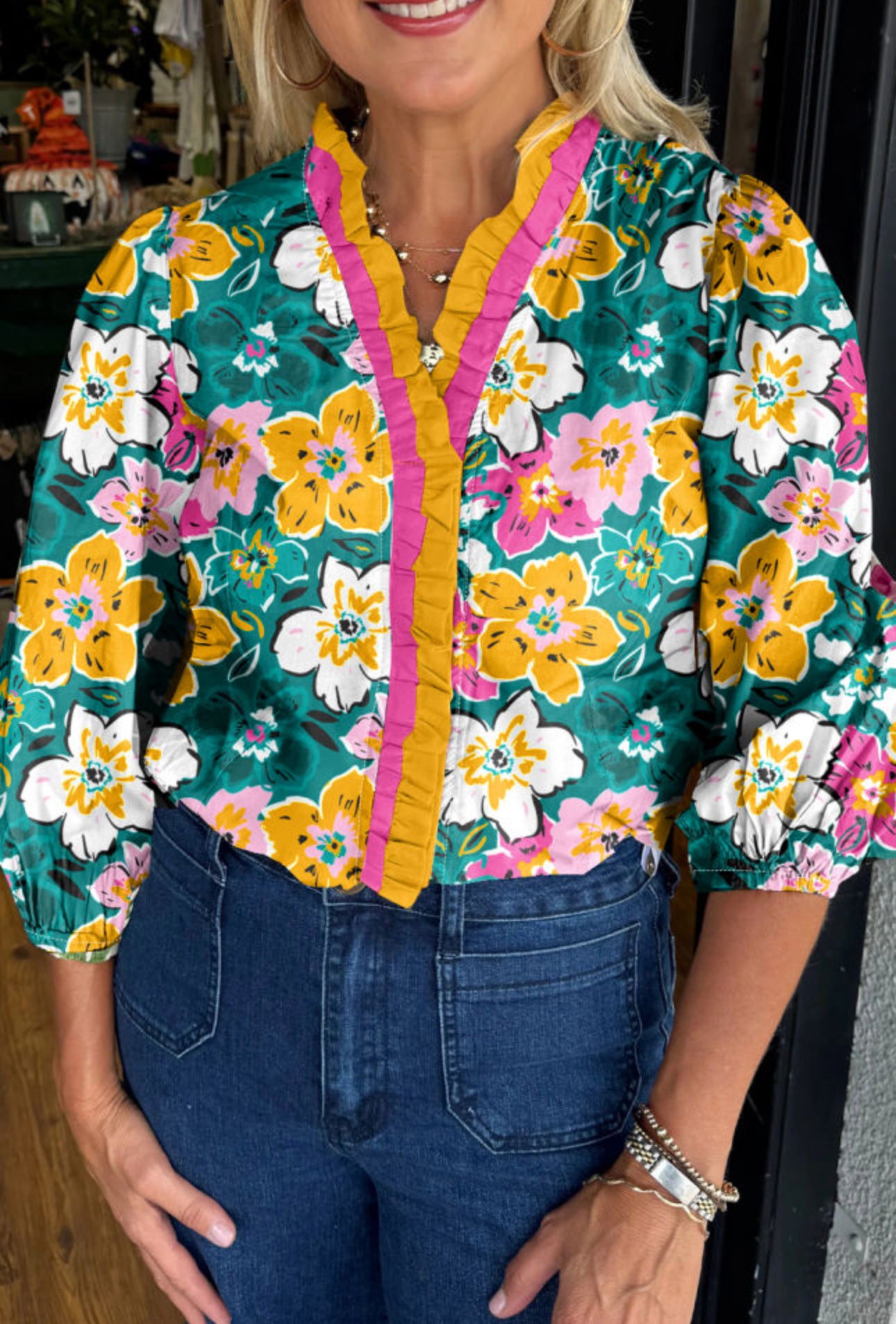 Take Me Away Floral Ruffle Top - Large is backordered and will ship as soon as it is back in stock.