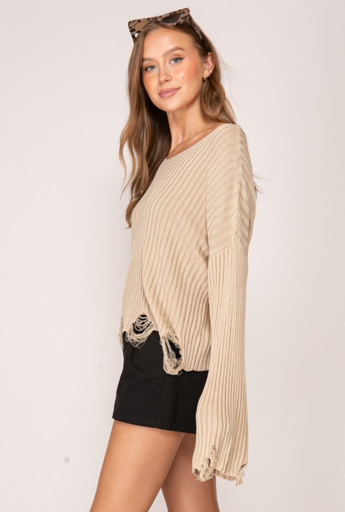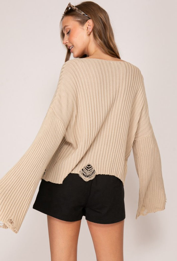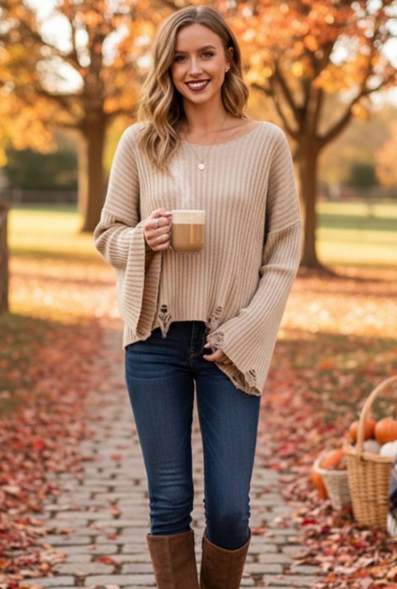 Elevate your knitwear collection with this stylish boat neck sweater top! Featuring a chic boat neckline, it beautifully frames the collarbone and adds a touch of elegance. The bell sleeves create a flowing silhouette that adds movement and flair to your outfit. The distressed trim brings a trendy, relaxed vibe, making this sweater a perfect blend of casual and chic. Pair it with your favorite jeans or skirt for a stylish look that transitions effortlessly from day to night. Embrace comfort and style with this must-have sweater!